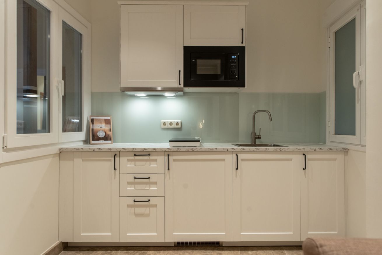 Equipamiento del apartamento: Aire acondicionado y calefacción, nevera, aseo, microondas, cocina, TV de pantalla plana, utensilios de cocina, armario, papel higiénico, ropa de cama y toallas.